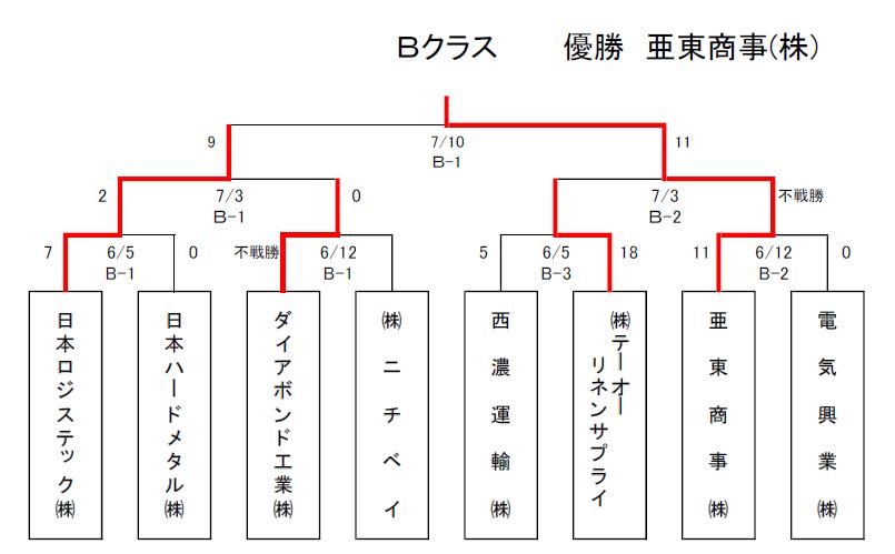 内陸工業団地協同組合の軟式野球大会の結果をお知らせします。7月20日から8月24日にかけて行われました。 A、B 両クラスともに6チームが出場して、次のとおりの結果となりました。